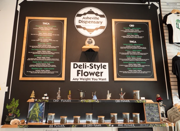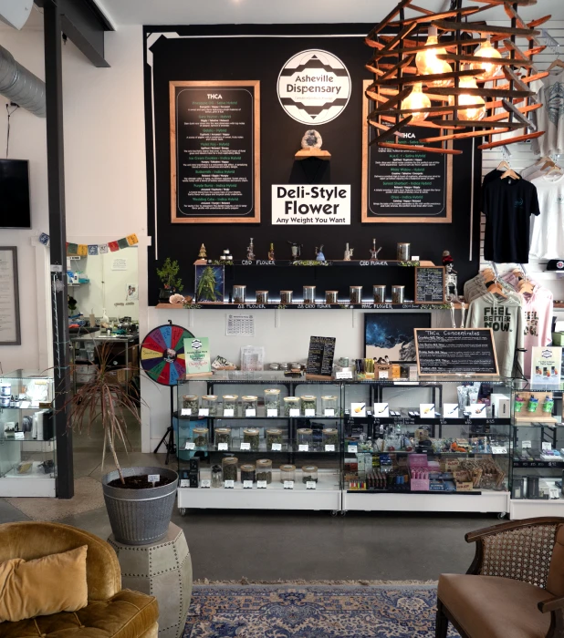 Our dispensary, located at 919 Haywood Rd #111, Asheville, NC 28806, is easily accessible and designed to provide a comfortable shopping experience. Explore our wide range of products, including cannabis flower, edibles, topicals, and more, all made with quality, organic ingredients.