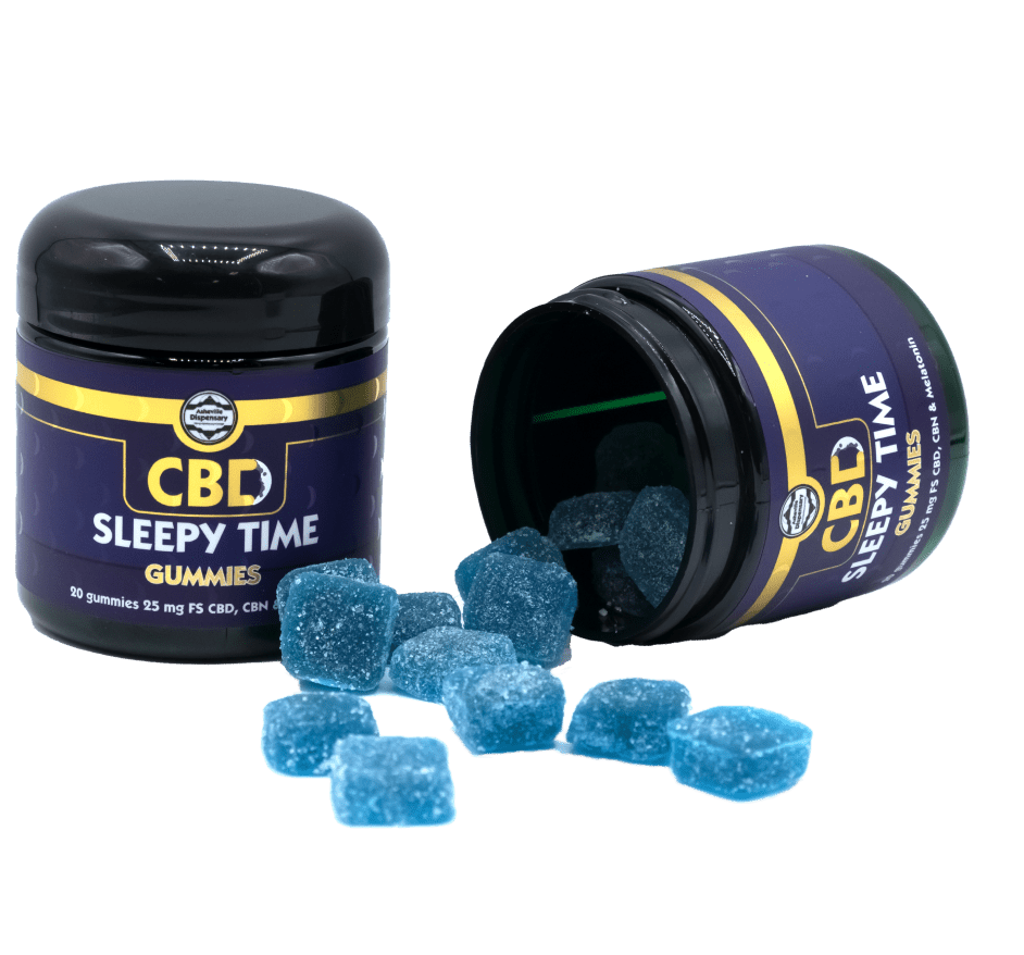 Asheville Dispensary’s CBD Sleepy Time Gummies contain 25mg of full-spectrum cannabinoids per gummy, including 20mg CBD (with 1-2mg THC), 5mg CBN, and 3mg Melatonin. These gummies are formulated to promote relaxation and enhance sleep quality.