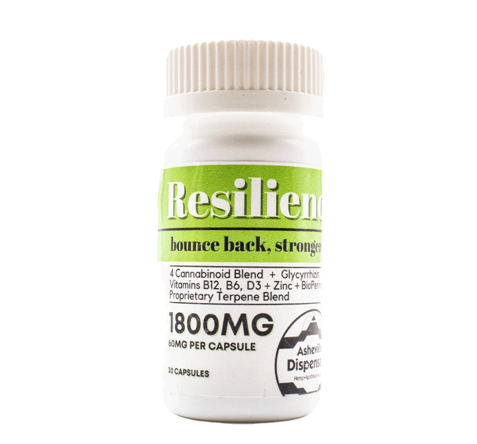 Asheville Dispensary’s Resilience is a comprehensive wellness supplement combining acidic and non-acidic cannabinoids. Each capsule contains a balanced blend of CBDa, CBD, CBGa, CBG, and full-spectrum hemp extract, providing 1800mg of total cannabinoids per bottle to support overall well-being.