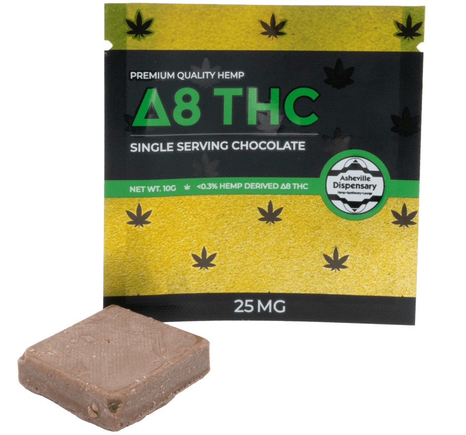 Asheville Dispensary’s Delta 8 Single Serve 25mg chocolate combines cannabis with the sweet taste of chocolate. Each chocolate contains a potent 25mg dose of Delta 8 THC, providing a consistent and enjoyable experience.